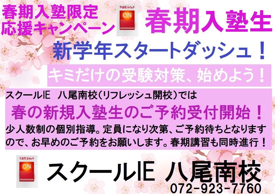 【2026 春期入塾体験受付開始】20年以上実績ある八尾南校!『リフレッシュ開校』無料学力検査、無料体験授業も受付中。少人数制。現在混み合っており、お急ぎの場合、直接ご連絡をお願いいたします。TEL:072-923-7760