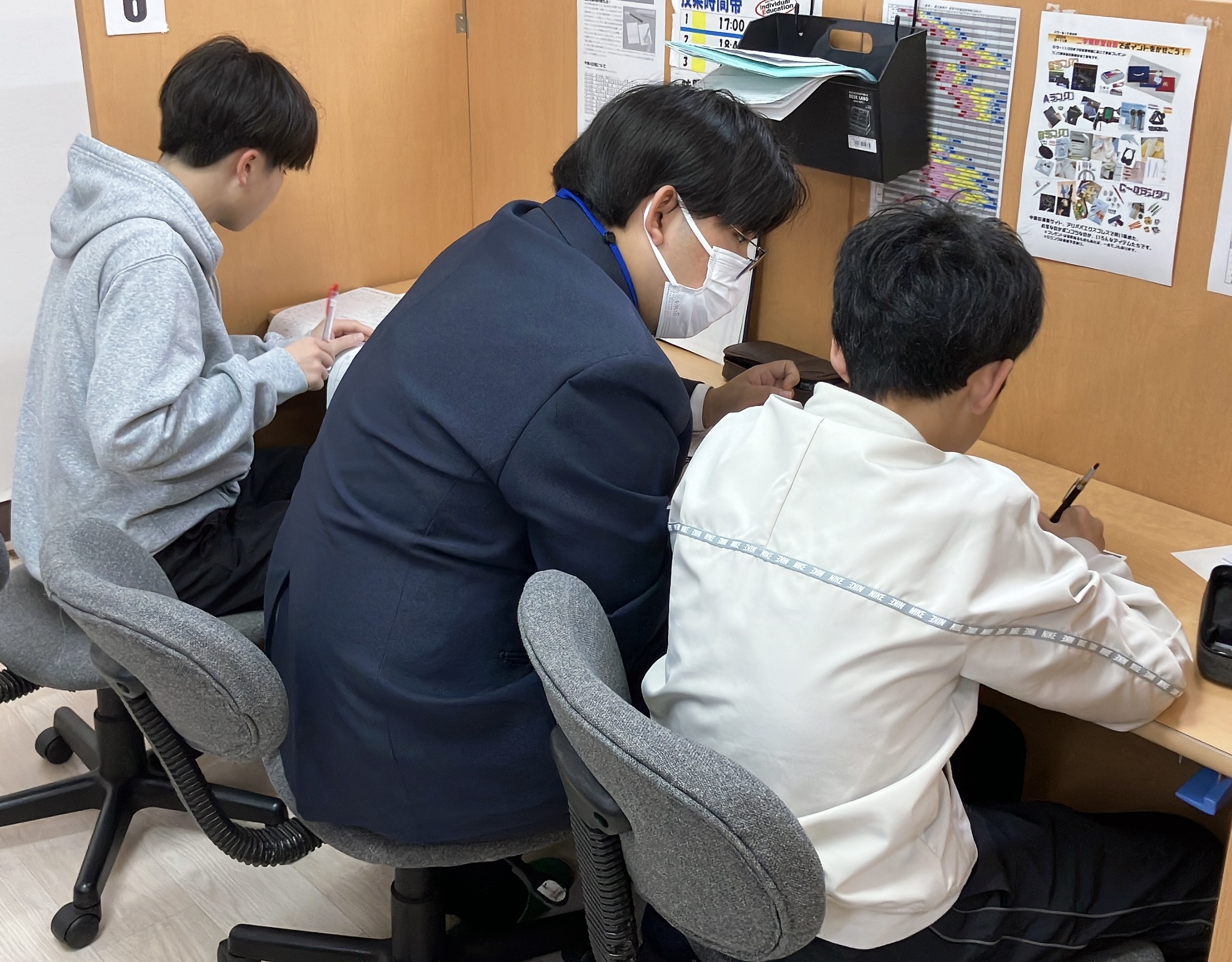 講師1人に生徒2人の授業。2人の生徒を同時に指導するのではなく、解説と演習を交互に繰り返しながら、それぞれに必要な内容を理解できるまで指導していきます。