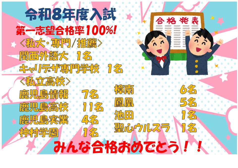 紫原で10年、谷山で9年の経験を活かし、生徒の成績に見合った指導や学習環境を提案します!