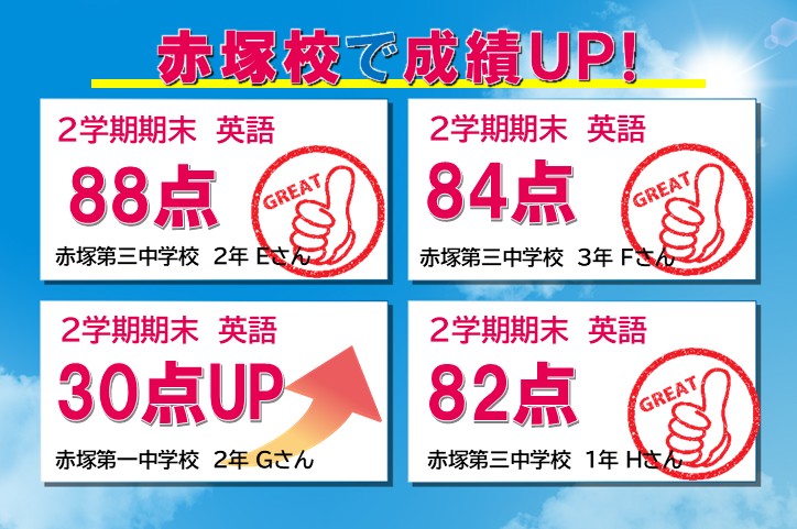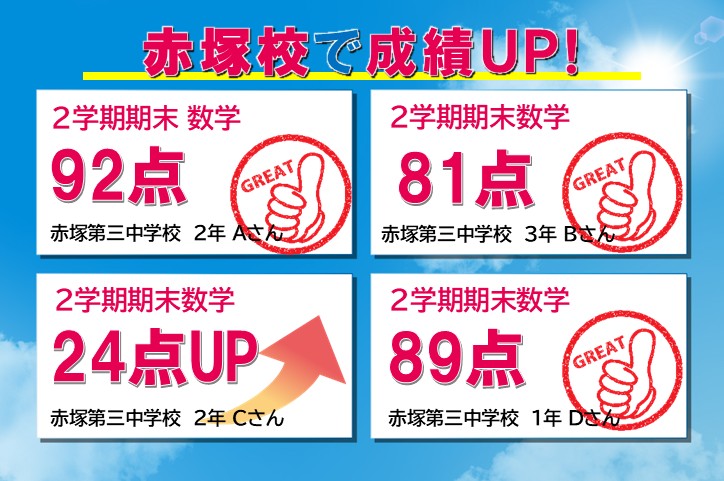 赤塚第三中学校・赤塚第一中学校に合わせた対策も万全です!学校ごとの出題傾向や学習進度をふまえ、効率的かつ無理のない学習スケジュールを組み立てます。