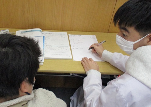 講師1人に生徒2人の授業。2人の生徒を同時に指導するのではなく、解説と演習を交互に繰り返しながら、それぞれに必要な内容を理解できるまで指導していきます。