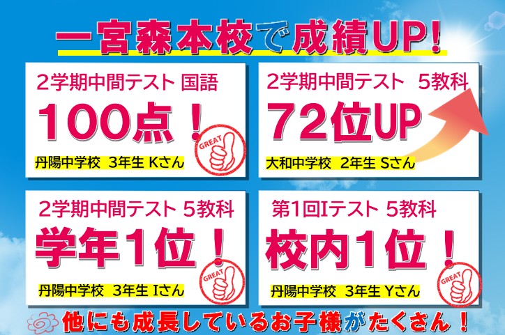 中学では、定期テストの成績が内申書に直結するので、いつものテストと気を抜かず、結果を出すことが大事。それには、いち早く定期テスト対策に取り組む事が鍵に! スクールIE 一宮森本校では、一人ひとりに合わせてテスト結果の見直しと分析を行います。また、志望校別の入試問題分析と徹底対策など、受験に向けた対策も実施中です。キミの「やる気スイッチをON」にして、目標点を目指そう!