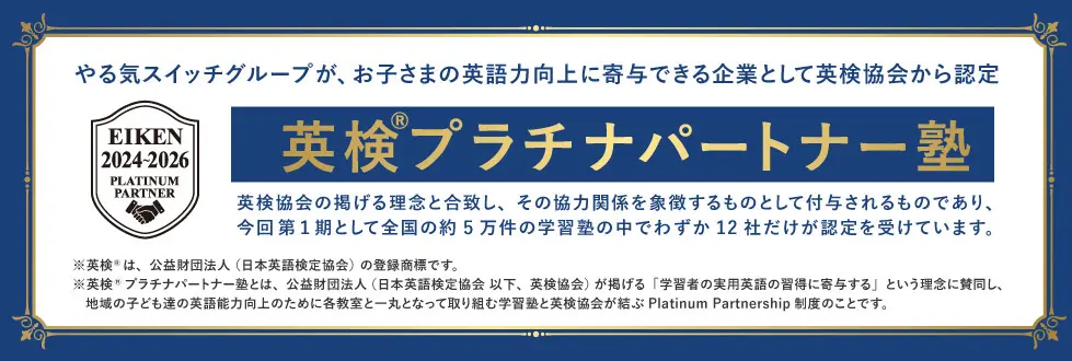 当校では、英語教育・英検®推進に力を入れており、2026年度も「英検®プラチナパートナー塾」として認定されています。