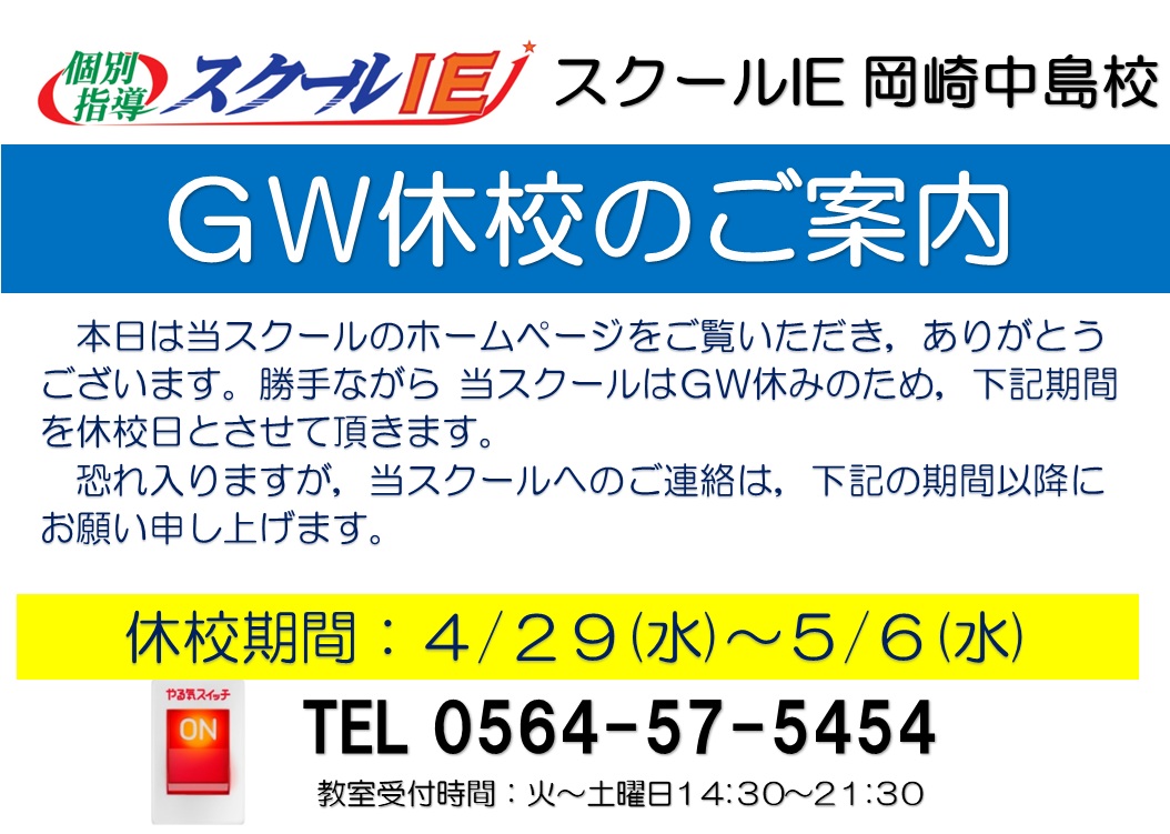 4月29日(水)から5月6日(水)までの間のGW期間、当スクールは休講いたします。