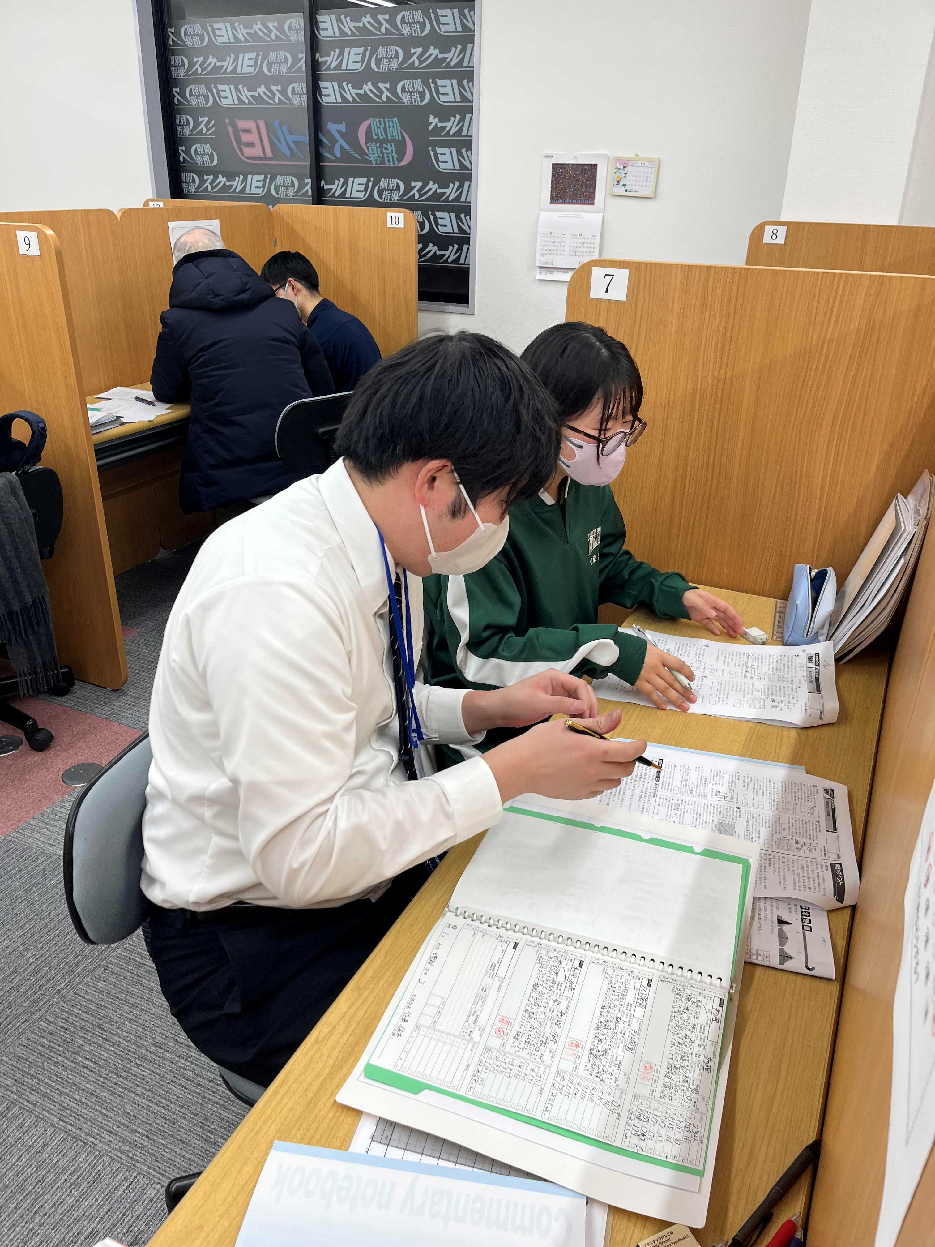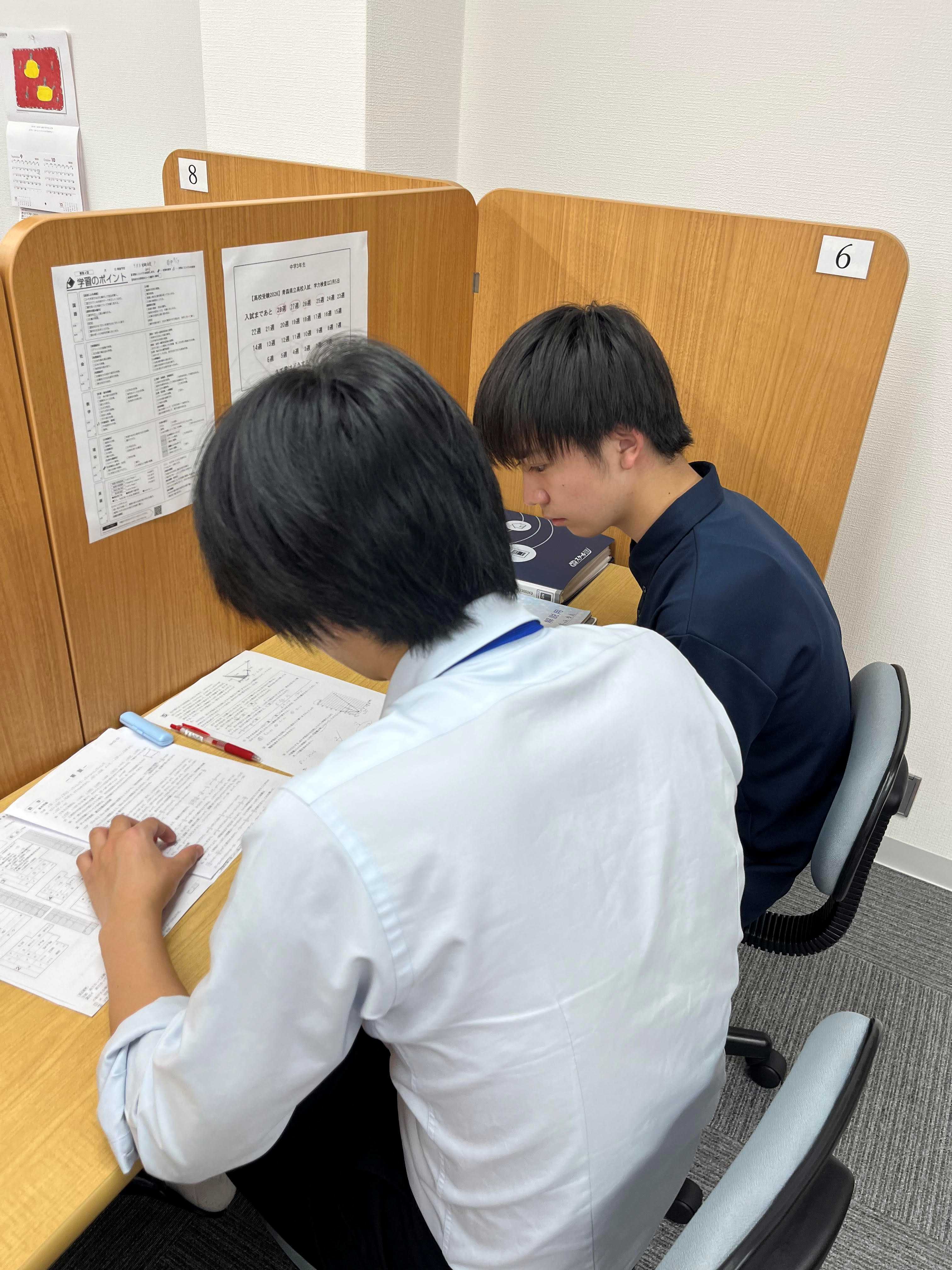 講師1人に生徒2人の授業。2人の生徒を同時に指導するのではなく、解説と演習を交互に繰り返しながら、それぞれに必要な内容を理解できるまで指導していきます。