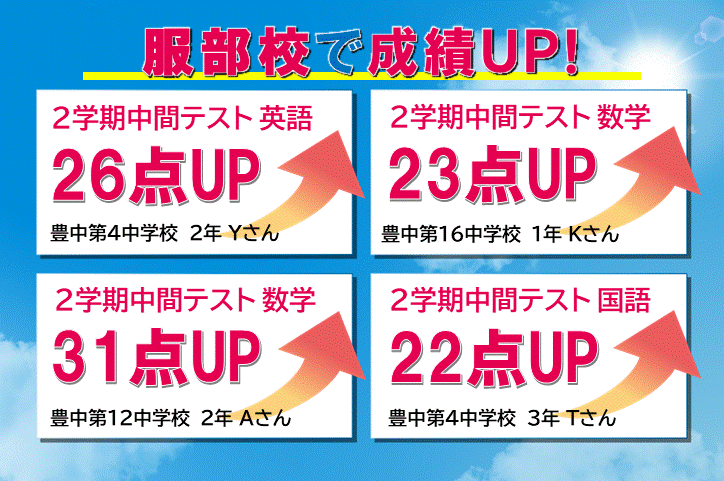 スクールIE服部校では「褒めて伸ばす」という方針のもと、生徒ひとりひとりの個性に合わせた指導で成績アップをサポートしています。
