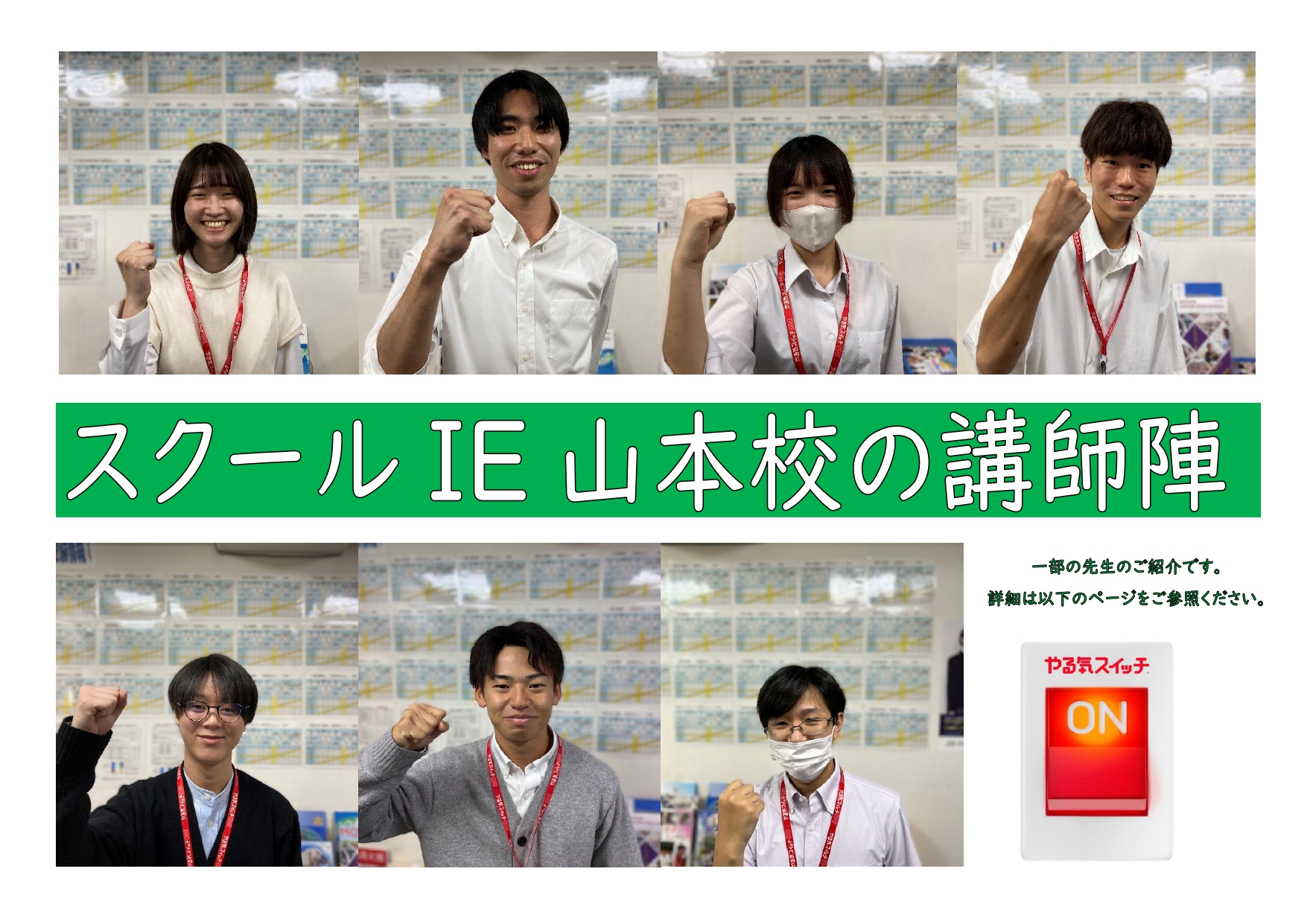 スクールIE 山本校では教室スタッフ一丸となって、生徒さんに学ぶことの面白さ、努力して味わえる充実感、目標を達成する喜びを感じてもらえるよう日々取り組んでいます。
