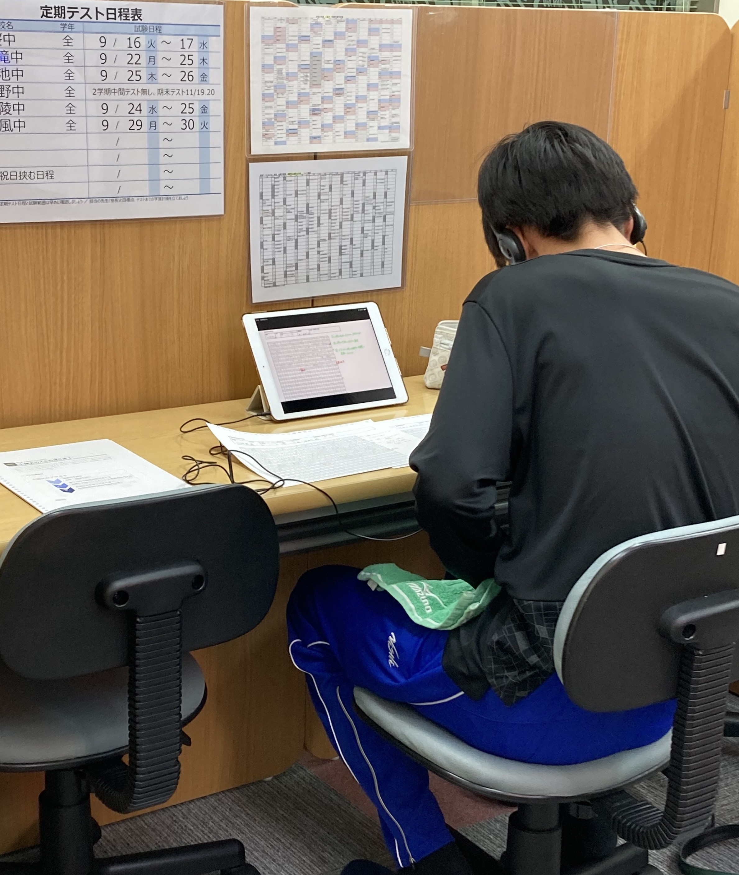 スクールIE 四日市桜校では定期テスト対策に力を注いでいます。通常授業枠においても2週間前から定期テスト対策の授業を行います。まず講師さんと相談しながら、生徒自身で今回のテストでの目標点を決定していただいています。その目標点を達成するために、何をすればよいのか計画をたてて、講師さんの指導のもと皆さん頑張っています。