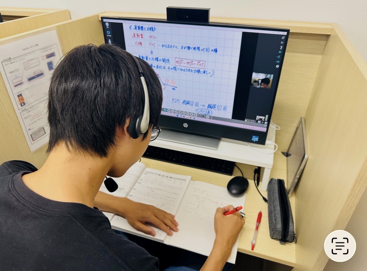 授業は当スクールに設置のパソコンとセンターの講師を繋いだ担任制個別指導(録画映像でなくライブ)となっているため、通常の授業と変わらず学校のプリントやテキストを使って授業を行うこともできます。