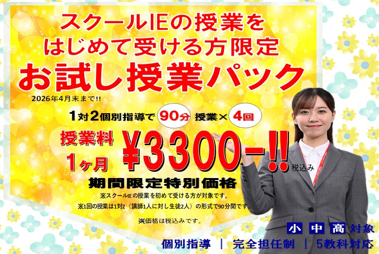 スクールIEでは、現在の学力や目標に応じて一人ひとりにピッタリの学習プランをオーダーメイドでつくります。苦手教科の克服、定期テストや内申対策、受験対策など、1教科から自由に受講できます。詳しくはお気軽にご相談ください。