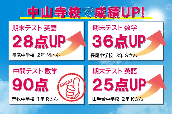 スクールIE中山寺校では地元の入試情報と試験対策、内申点の付け方を熟知した公立高校でも勤務経験のある教室長が受験までに残された時間と現状の学力を加味したベストな学習方法とカリキュラムで志望校合格を目指します。