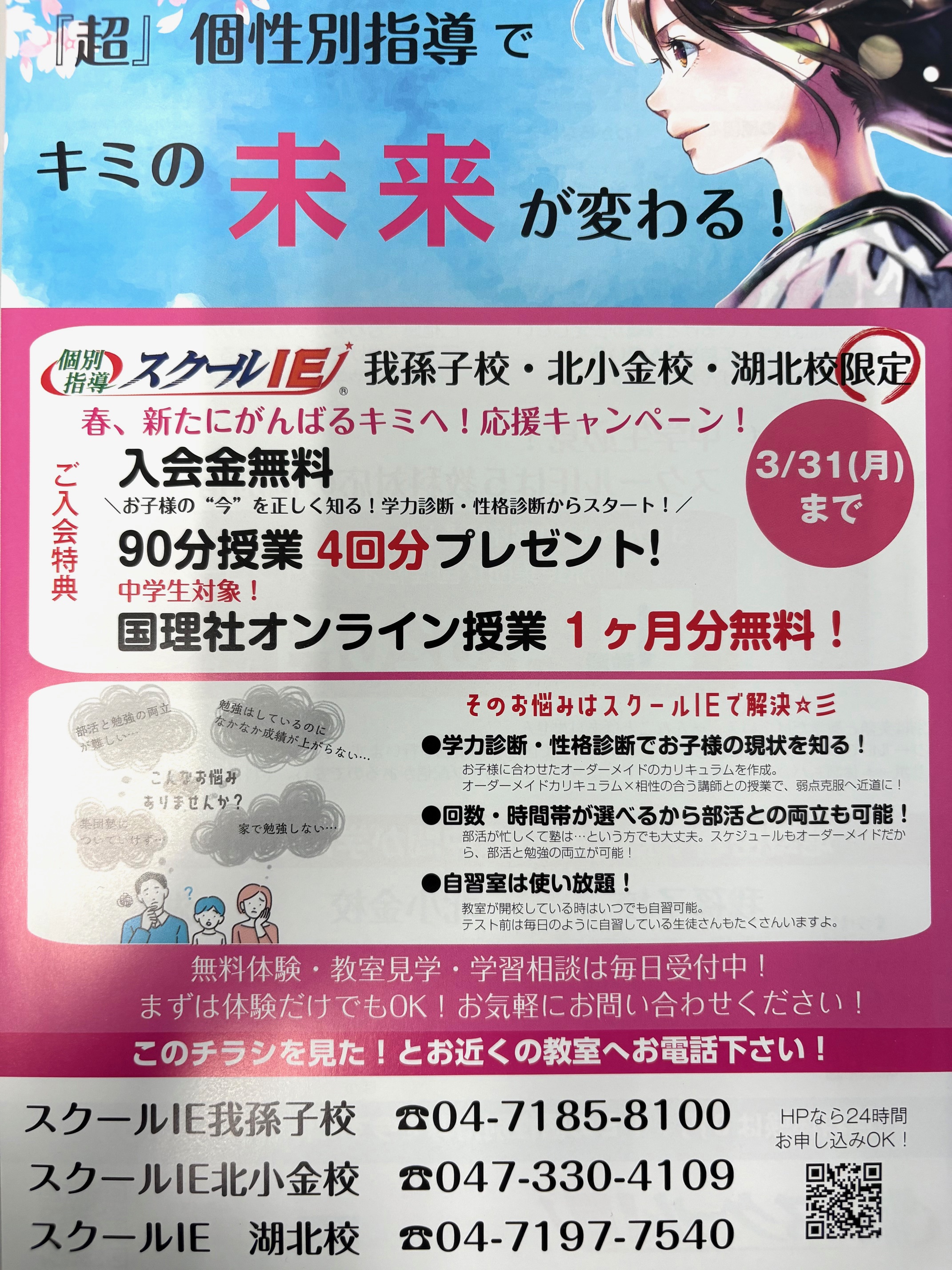 個別指導塾のスクールIE 我孫子校へようこそ!