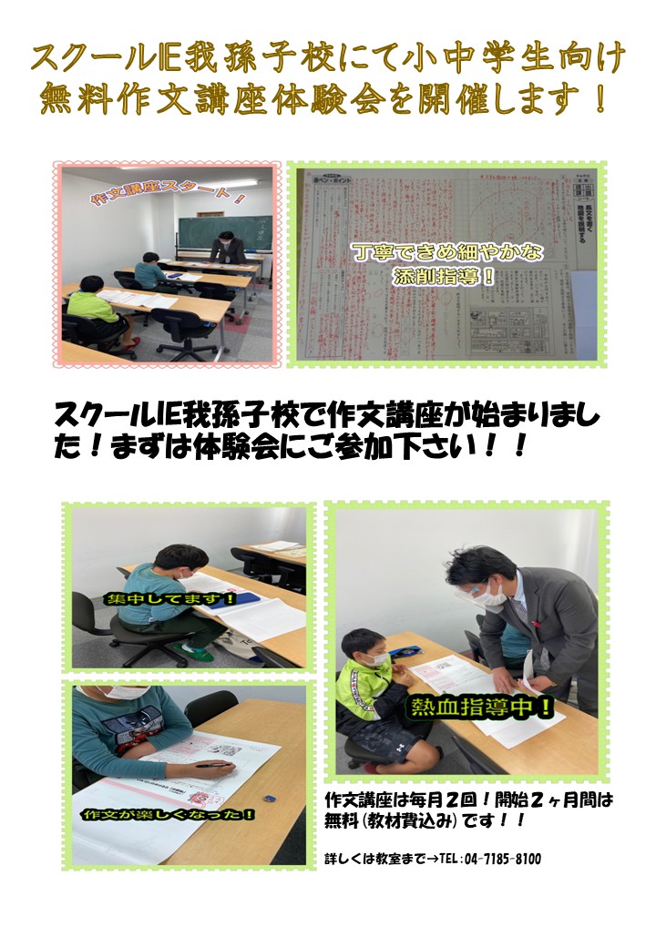スクールIE 我孫子校では、下記の日程で作文講座体験会を開催します。是非、奮ってご参加ください!!