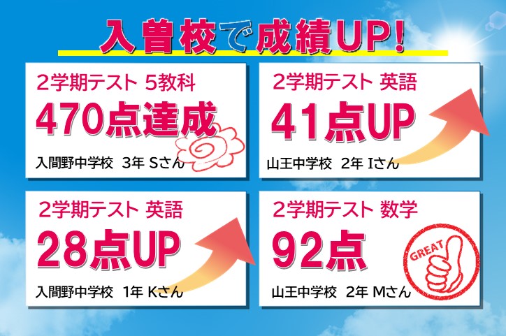 入曽校では、山王中・入間野中、南小・入間野小を中心に、多くのお子さまの学習をサポートしてきました。定期テストの傾向や高校の情報、北辰テストの見方など、この地域の学習事情には精通しています。