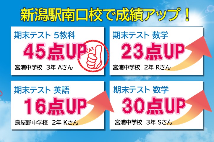 ●定期テスト対策 : 鳥屋野中、宮浦中、東新潟中、山潟中、木戸中、濁川中、柳都中、亀田中、高志中等教育学校、…など、年4回 (インフル対策中は、集団授業ではなく、個別授業で実施)