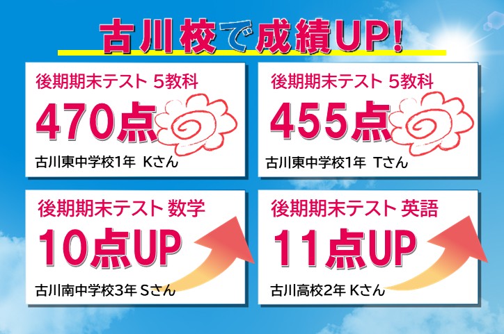 ・古川東中 1年 後期期末テスト 数学 10点UP 5教科 455点