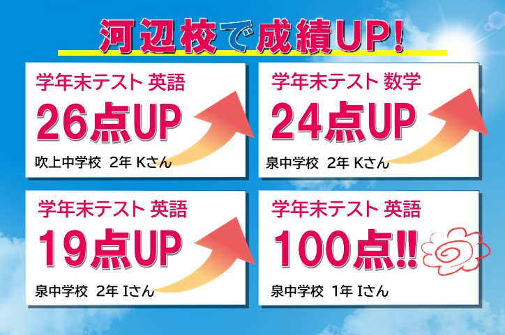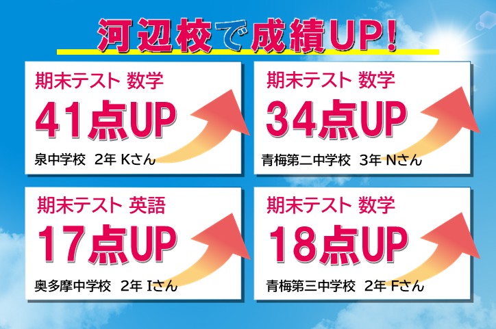 いつも丁寧に指導してくれている担当の先生に、学校でわからなかったことなどを細かく質問することができ、中学1年生の定期テストで学年でも30位以内に入ることができました!次の目標は学年20位です。スクールIE河辺校の先生と共に、目標達成に向けて頑張っていきたいです!