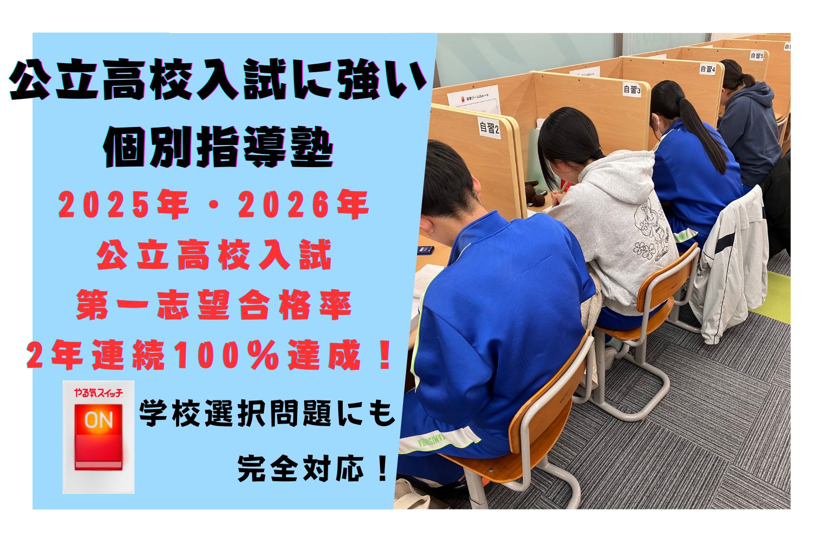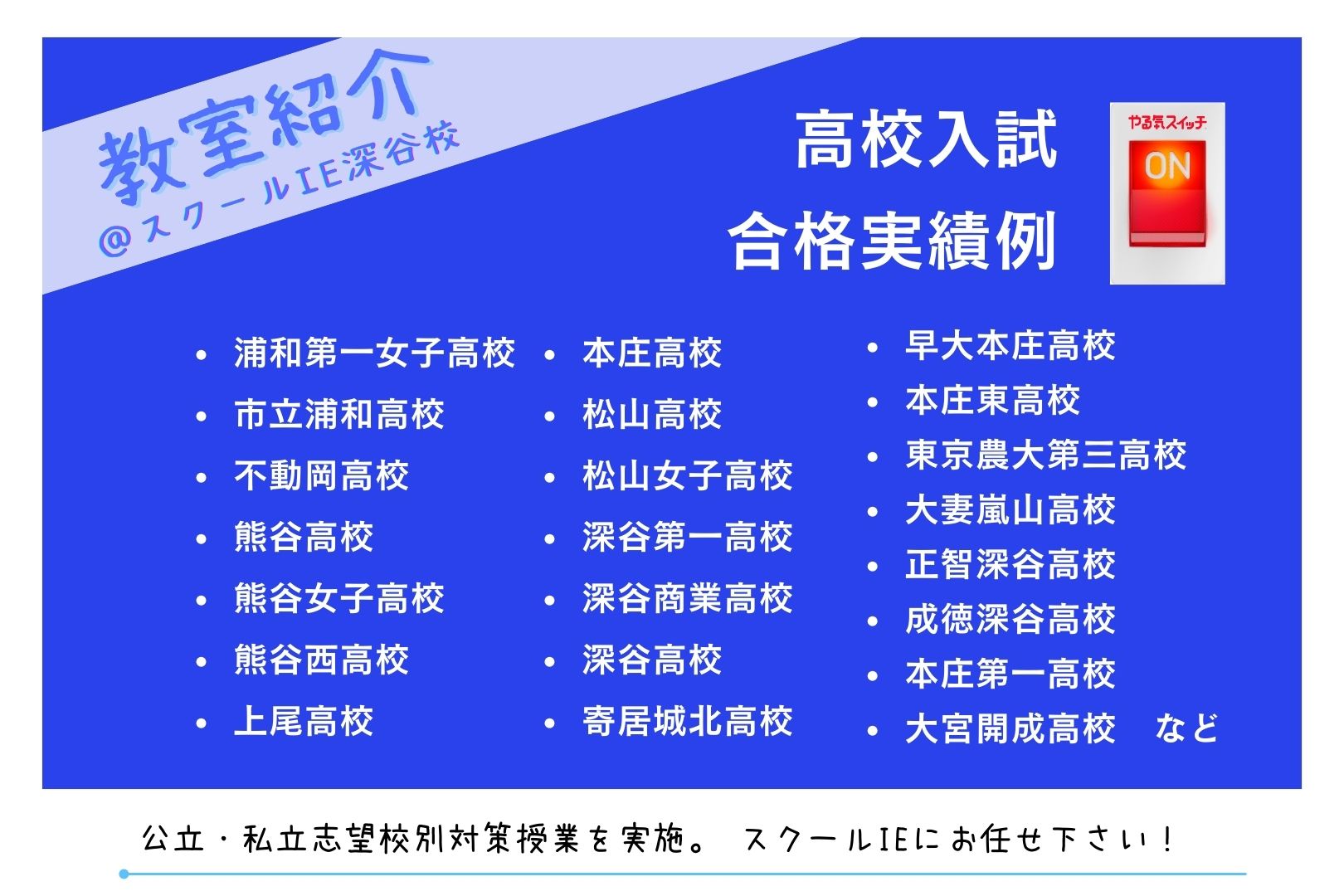スクールIE深谷校は、2025年度公立高校入試において「第一志望校合格率100%」を達成しました。