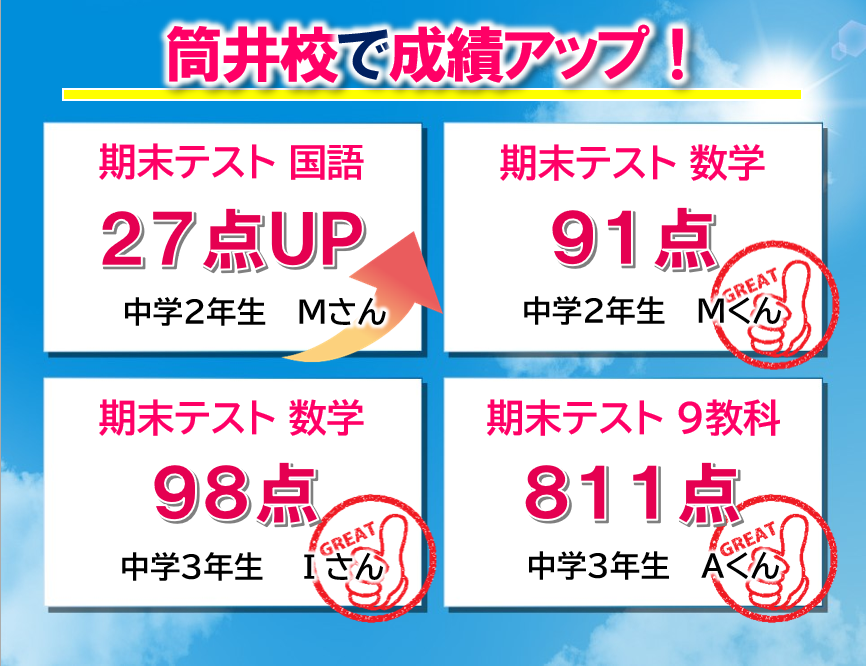 スクールIE 筒井校に通っている生徒さんの2学期期末テストの結果の一部をご紹介いたします。