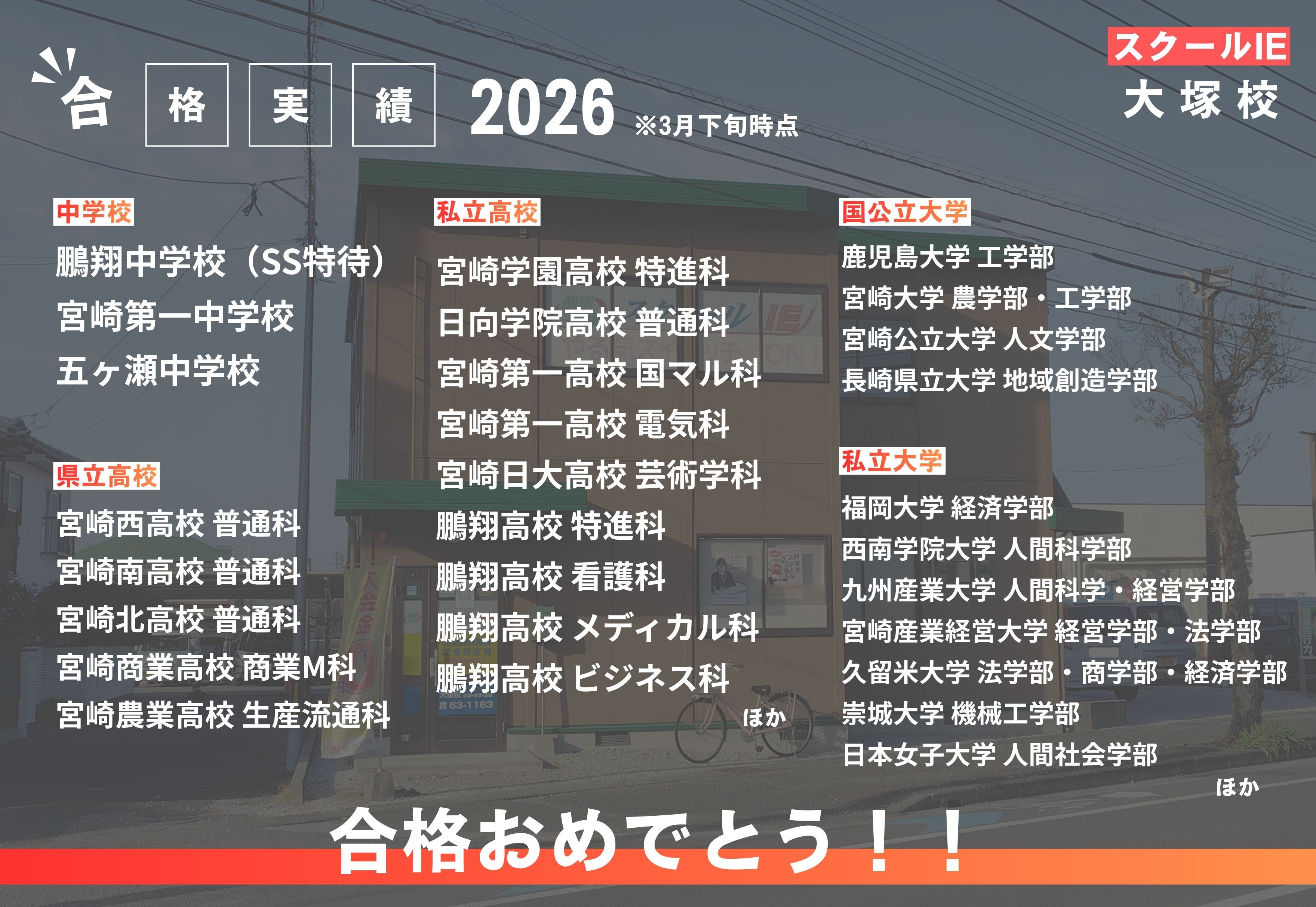 スクールIEホーム > 教室検索 > 宮崎県の教室検索結果一覧 > スクールIE大塚校