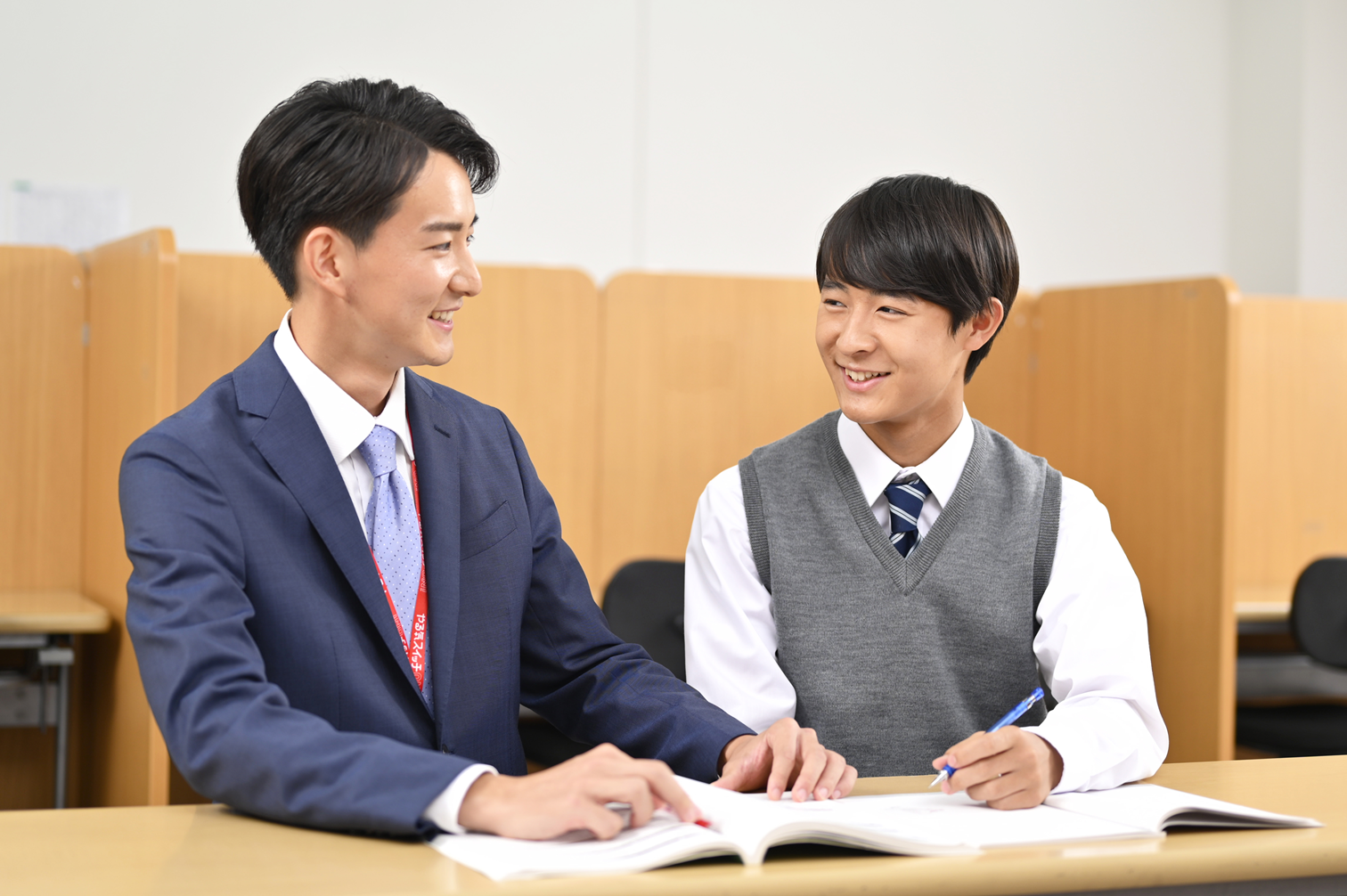 講師1人に生徒2人の授業。2人の生徒を同時に指導するのではなく、解説と演習を交互に繰り返しながら、それぞれに必要な内容を理解できるまで指導していきます。
