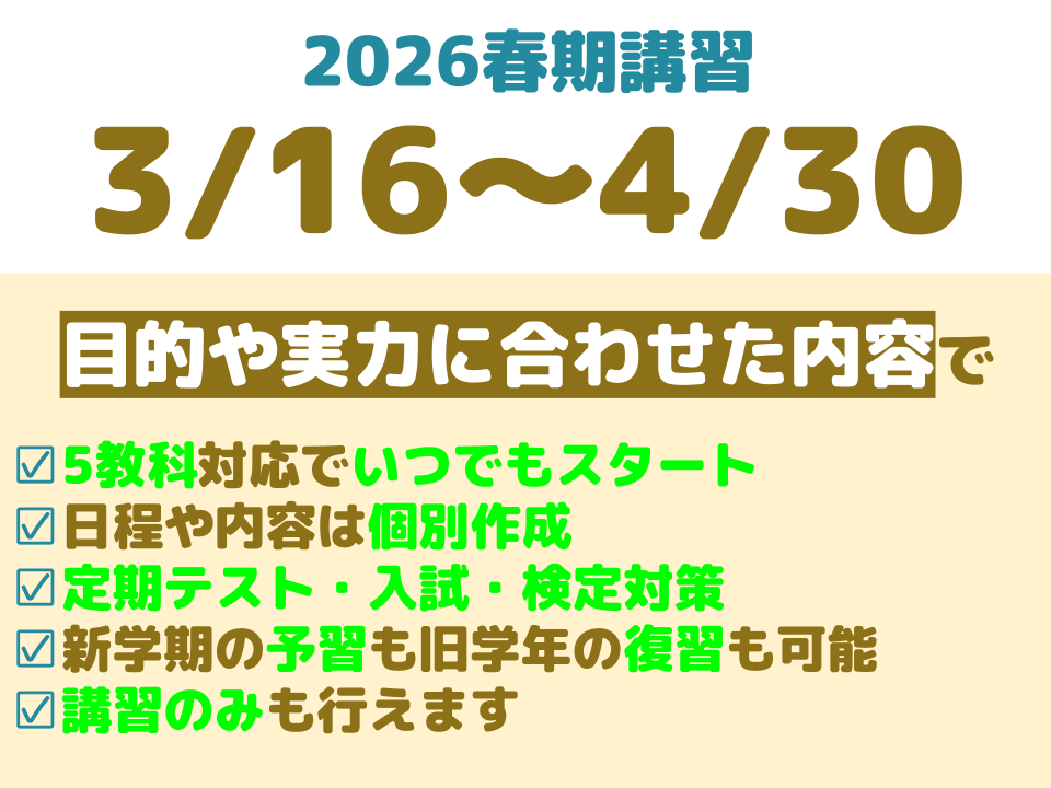 春期講習では新学年に向けた予習や復習、苦手単元克服なとを行います。