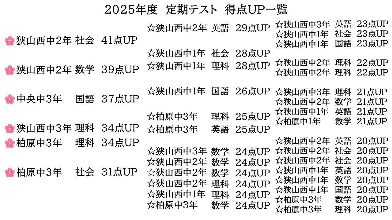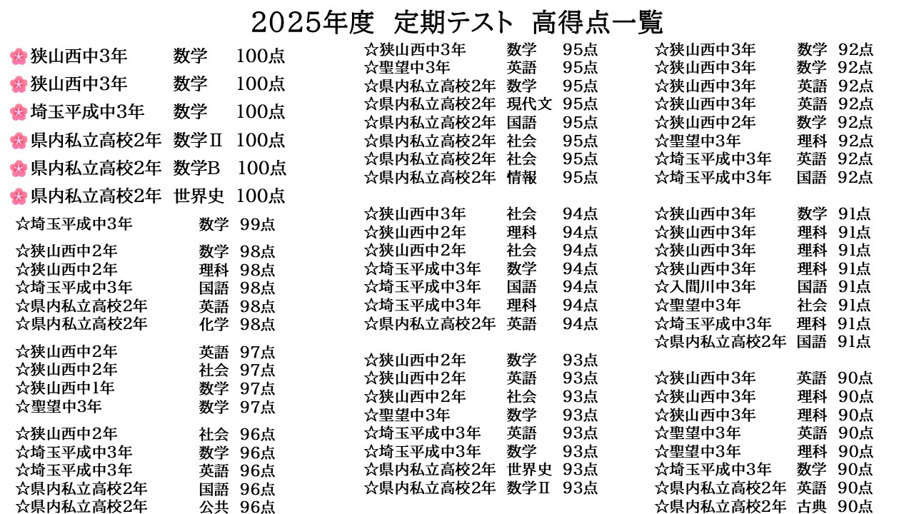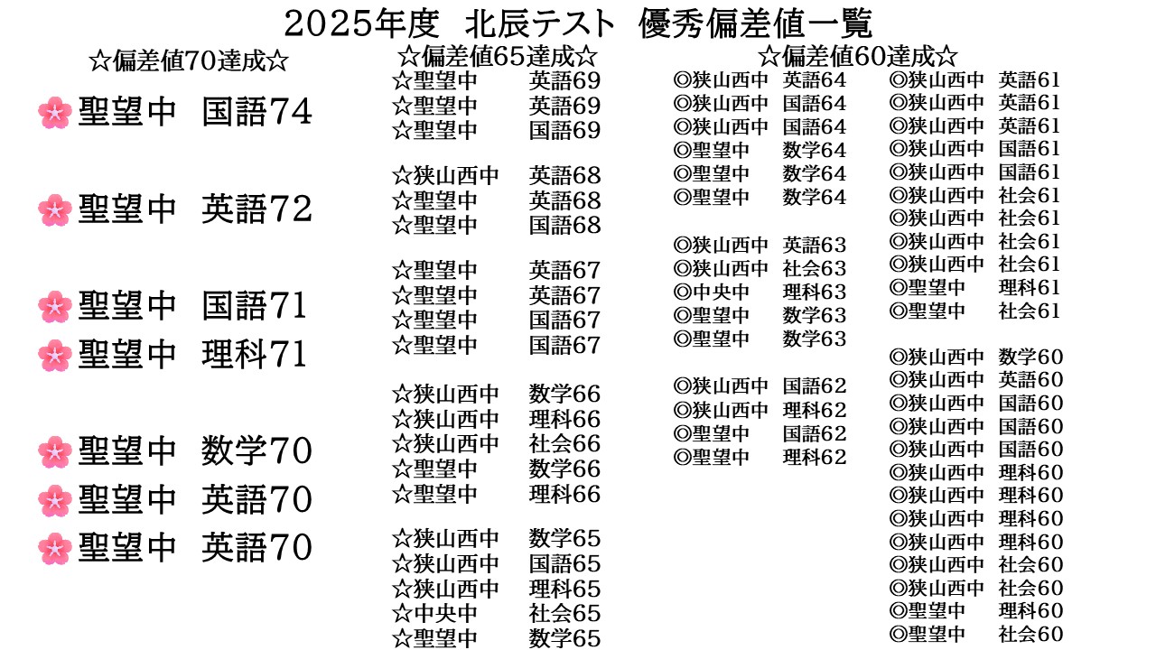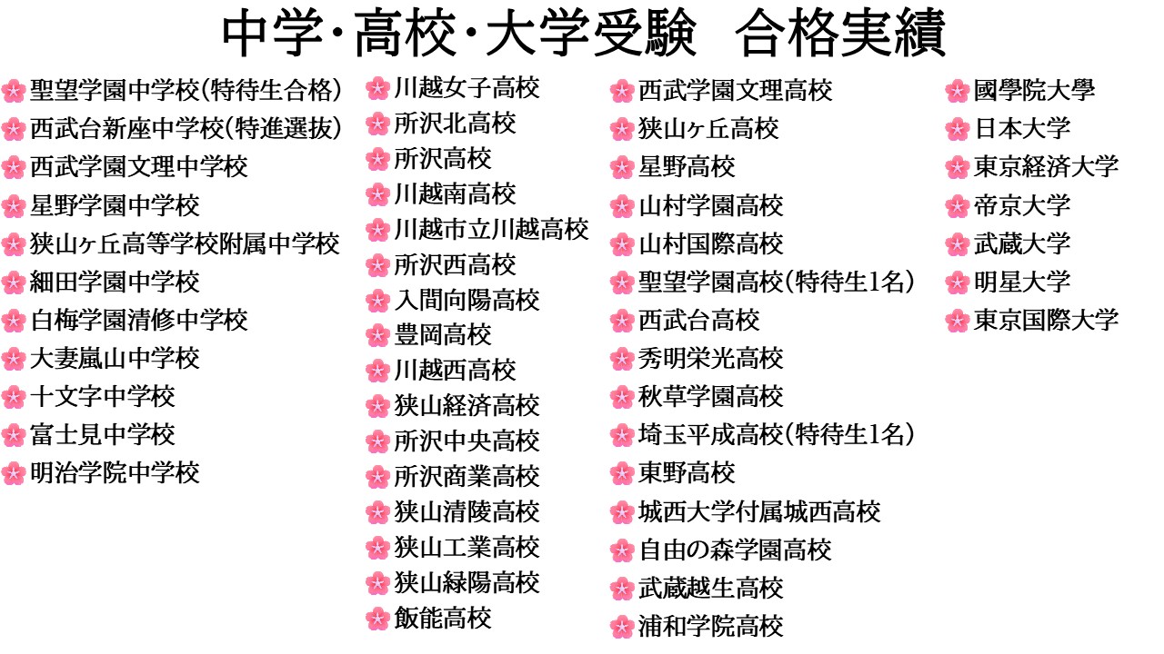 聖望学園中学校(特待生)・西武台新座中学校(特別選抜)・星野学園中学校・細田学園中学校・白梅学園清修中学校・大妻嵐山中学校・狭山ヶ丘中学校・富士見中学校・明治学院中学校・十文字中学校