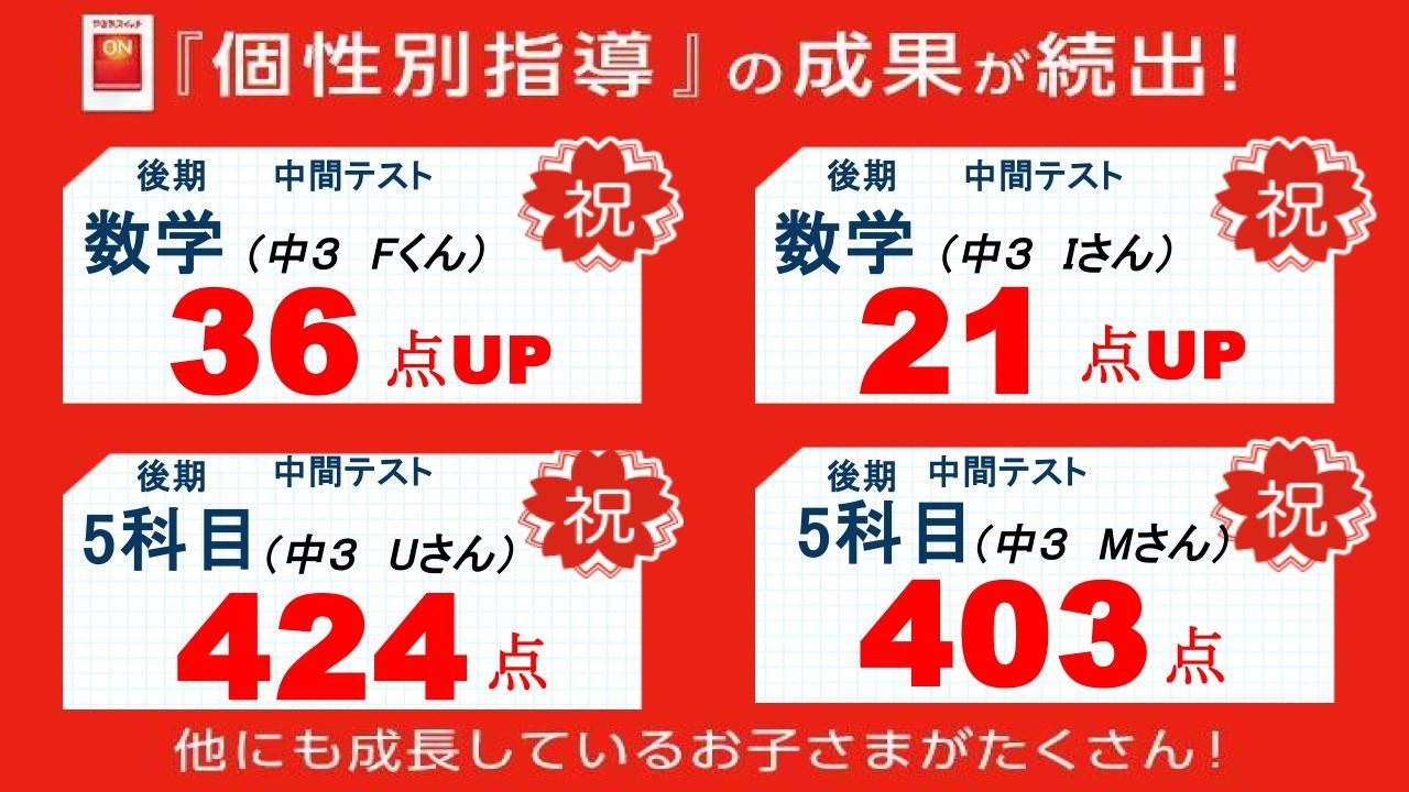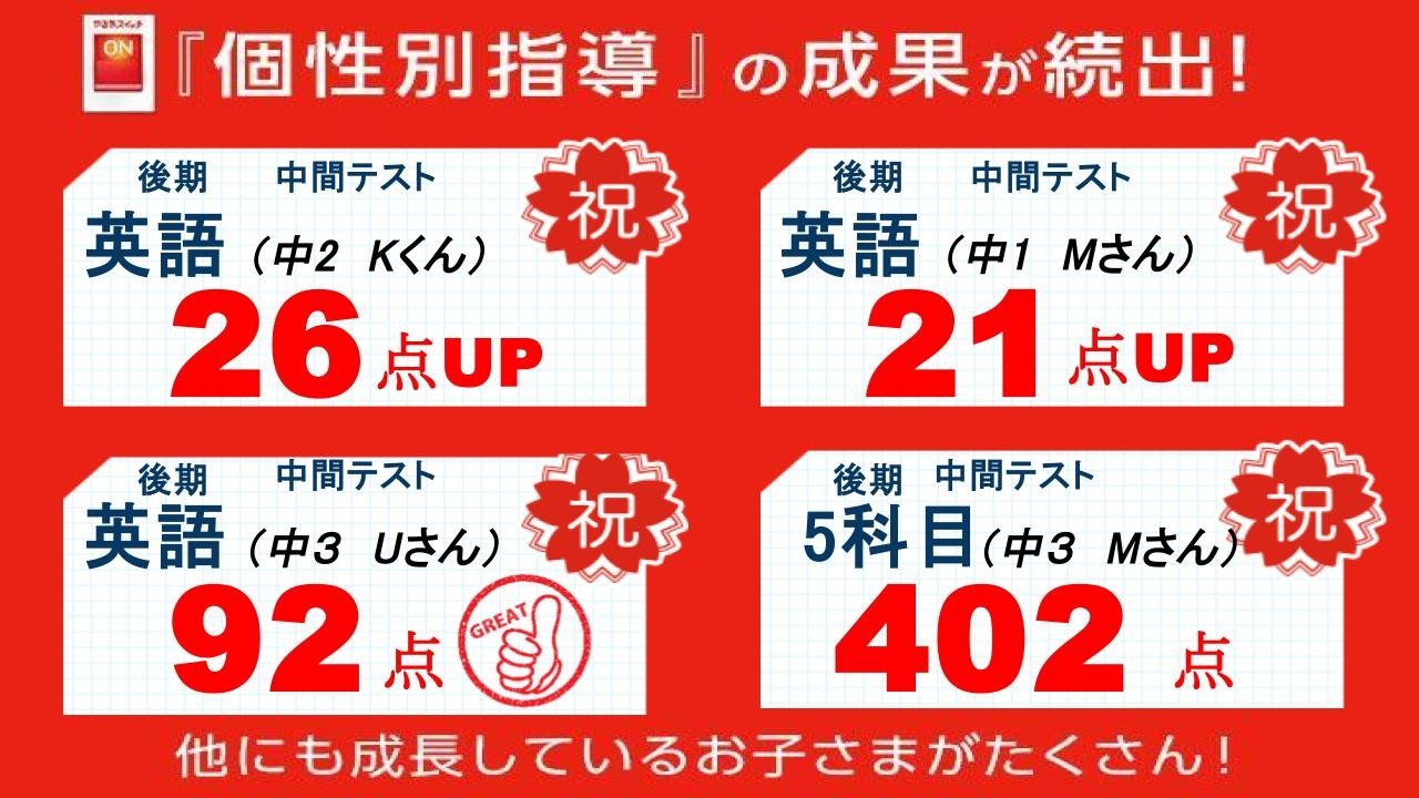矢向中の後期中間の成績において、5科目の点数が大幅にUPしたり、高得点を取れました。皆さん、おめでとうございます。