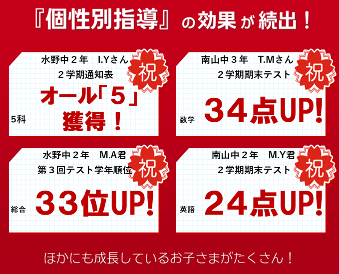 特に南山中学校、水野中学校は毎年多くの生徒さんに通塾していただいており、定期テスト対策は万全です!