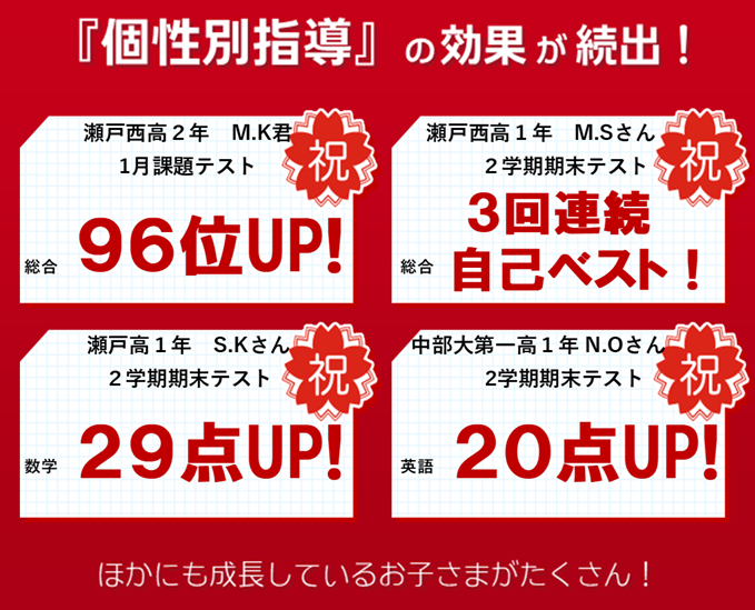 毎年、旭野高校や高蔵寺高校などの進学校から愛知商業高校や名古屋市工芸高校などの専門学科の高校まで、幅広い高校に合格者を輩出しています。