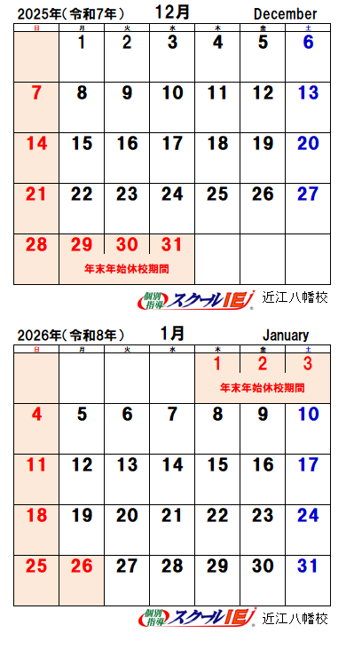 2025年12月・2026年1月の休校日/開校日をお知らせします。