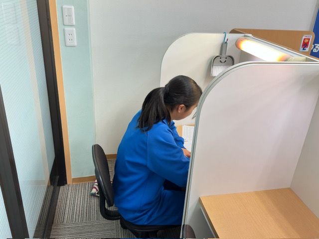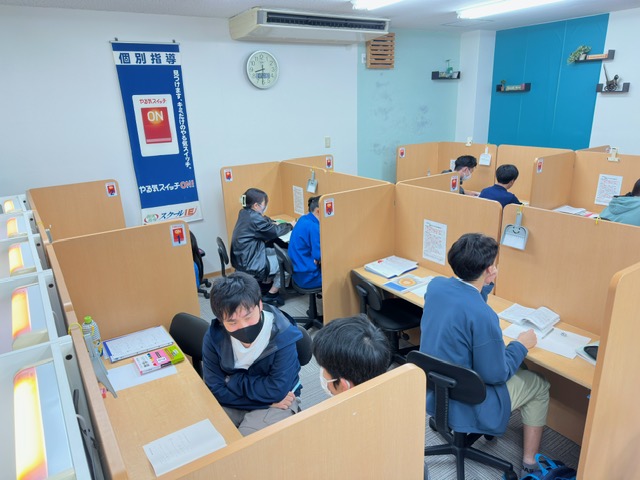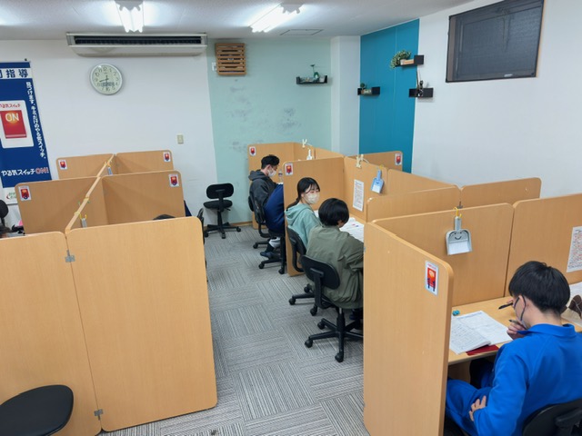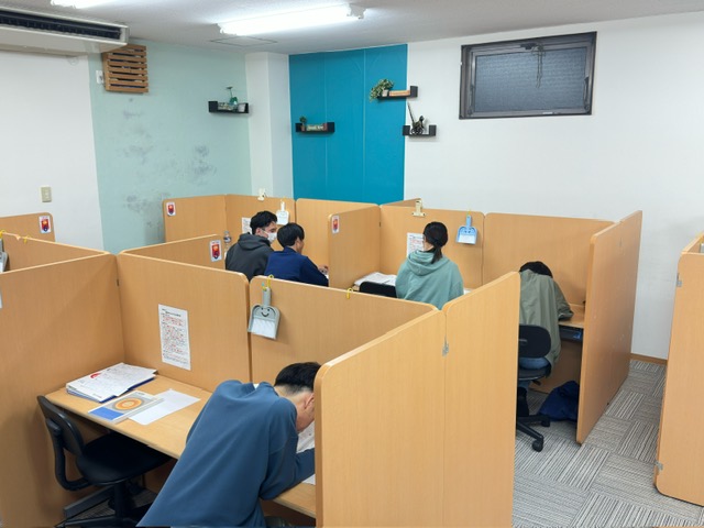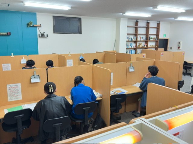 自習ブースも完備しており、教室開校時間中は在塾生・講習会生も自由に利用することができます。卒塾生もたまに学習しに来てくれて嬉しいですね。