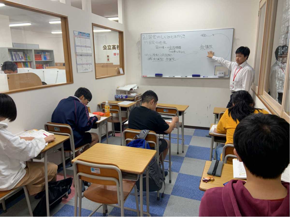 講師1人に生徒2人の授業。2人の生徒を同時に指導するのではなく、解説と演習を交互に繰り返しながら、それぞれに必要な内容を理解できるまで指導していきます。