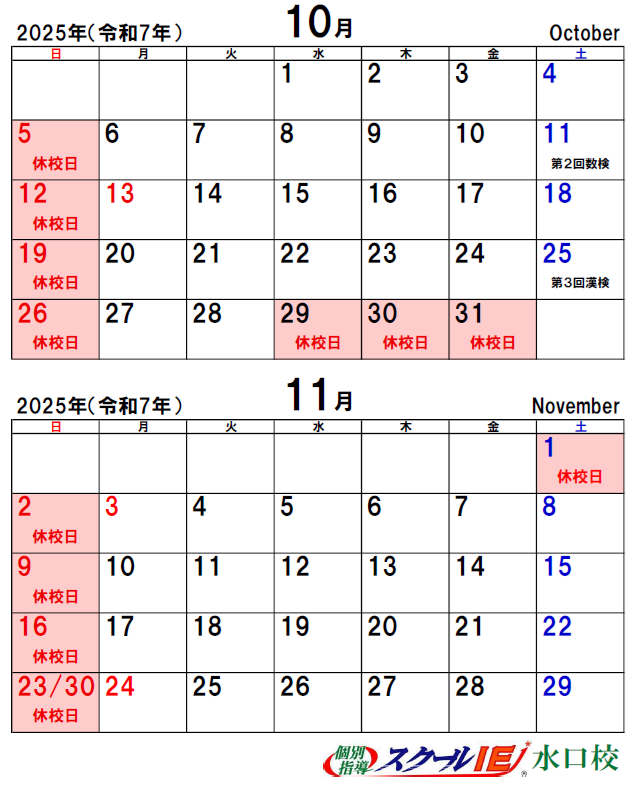 ・毎週日曜日と10/29(水)~11/1(土)が休校日となります。