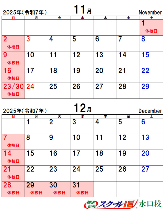 ・毎週日曜日と11/1(土)、12/29(月)~31(水)が休校日となります。