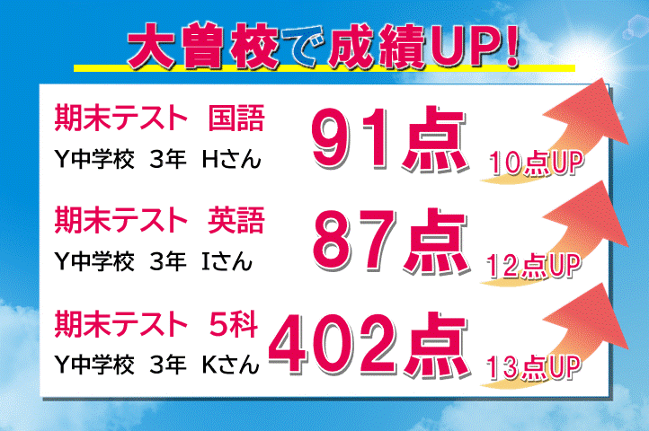入塾前の英語のテストでは平均点以下でした。入塾してからは相性のよい講師の方から普段の勉強だけでなく、家での勉強習慣についてもアドバイスをしてくださり勉強の仕方が徐々にわかってきた様子でした。また、試験本番2週間前に息子と先生で一緒に学習計画表を作成し、定期テストに向けて入念に準備を進めることができました。結果、英語は以前よりも30点上がり、息子は英語が好きになれたようで安心しました。
