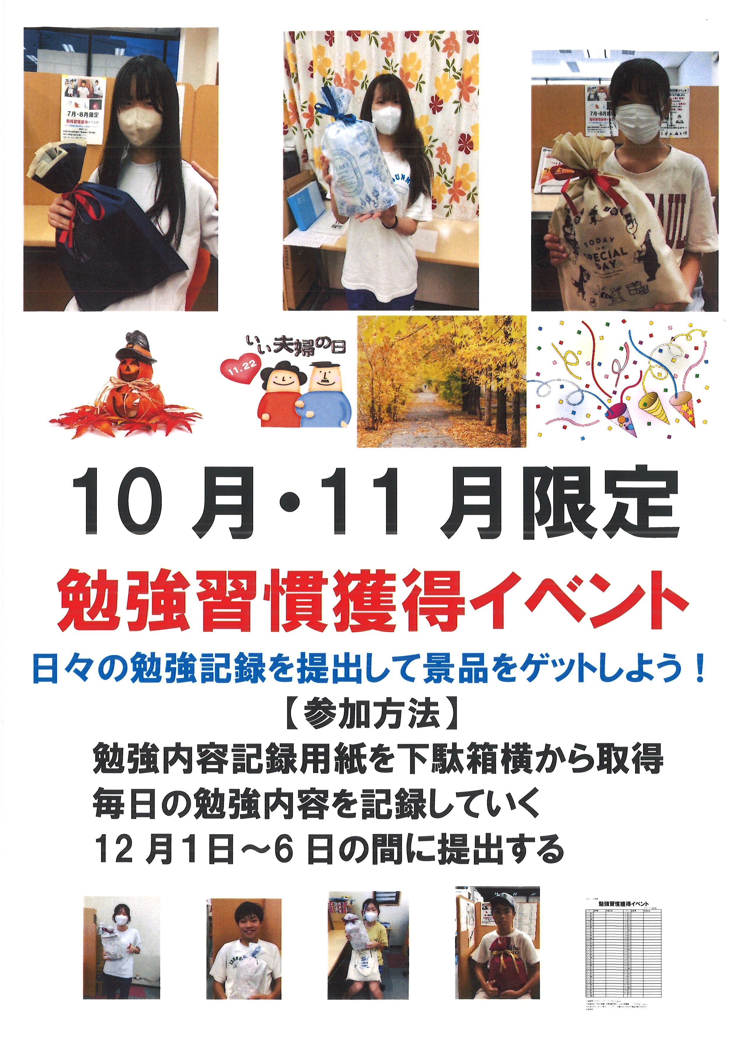 前回に続いて、10月・11月も勉強習慣獲得イベントを実施します!
