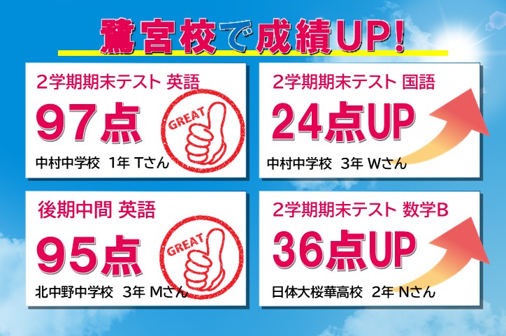 受験では、30点前後しか取れなかった苦手教科も本番当日は80点取ることができ、自分自身で成長を感じてとてもうれしかったです。細かいところまで丁寧に教えてくれた先生に感謝してます。
