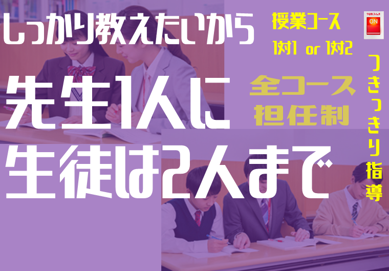 マンツーマンの授業。講師が生徒をつきっきりで指導するので、じっくりと学習を進めることが可能。疑問点は、いつでもその場で解消することができます。