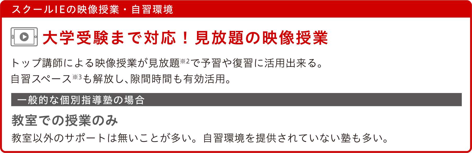 ※1.集団授業は中学生対象です。※2.映像授業はやる気スイッチプレミアムクラブ会員(月額税込220円)の特典となります。視聴にはタブレットやスマートフォン等の機器と通信環境が必要です。※3.教室によって設備や使用条件が異なります。